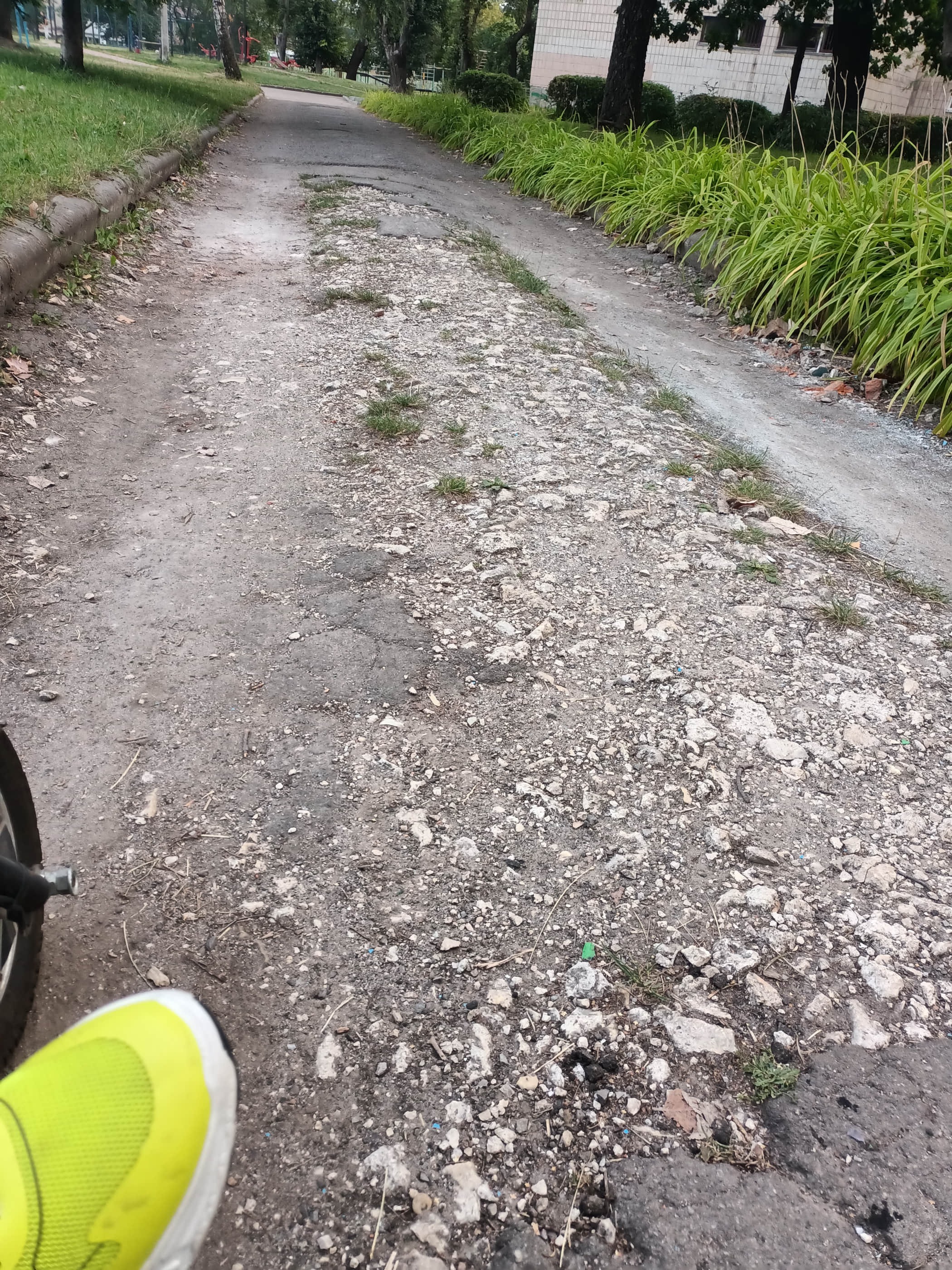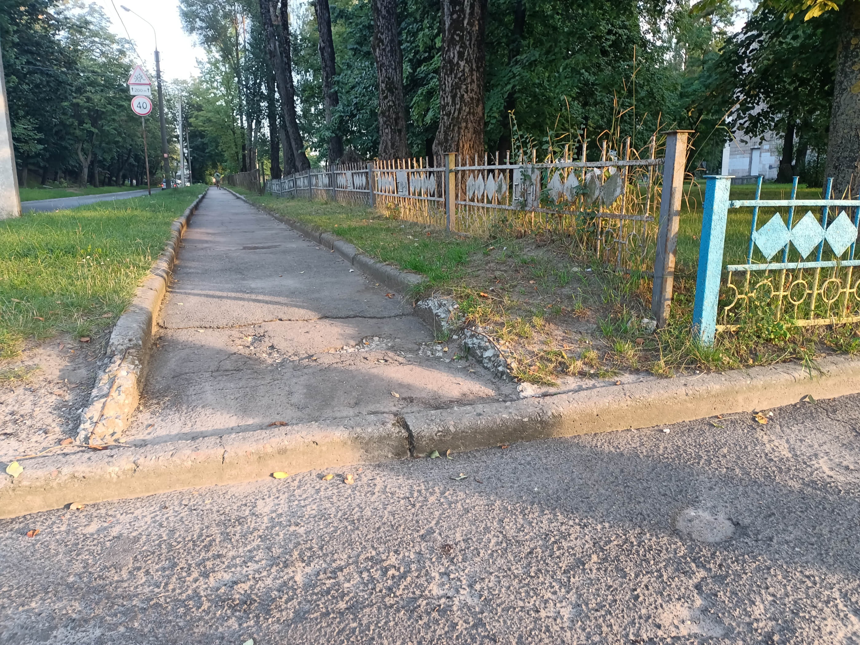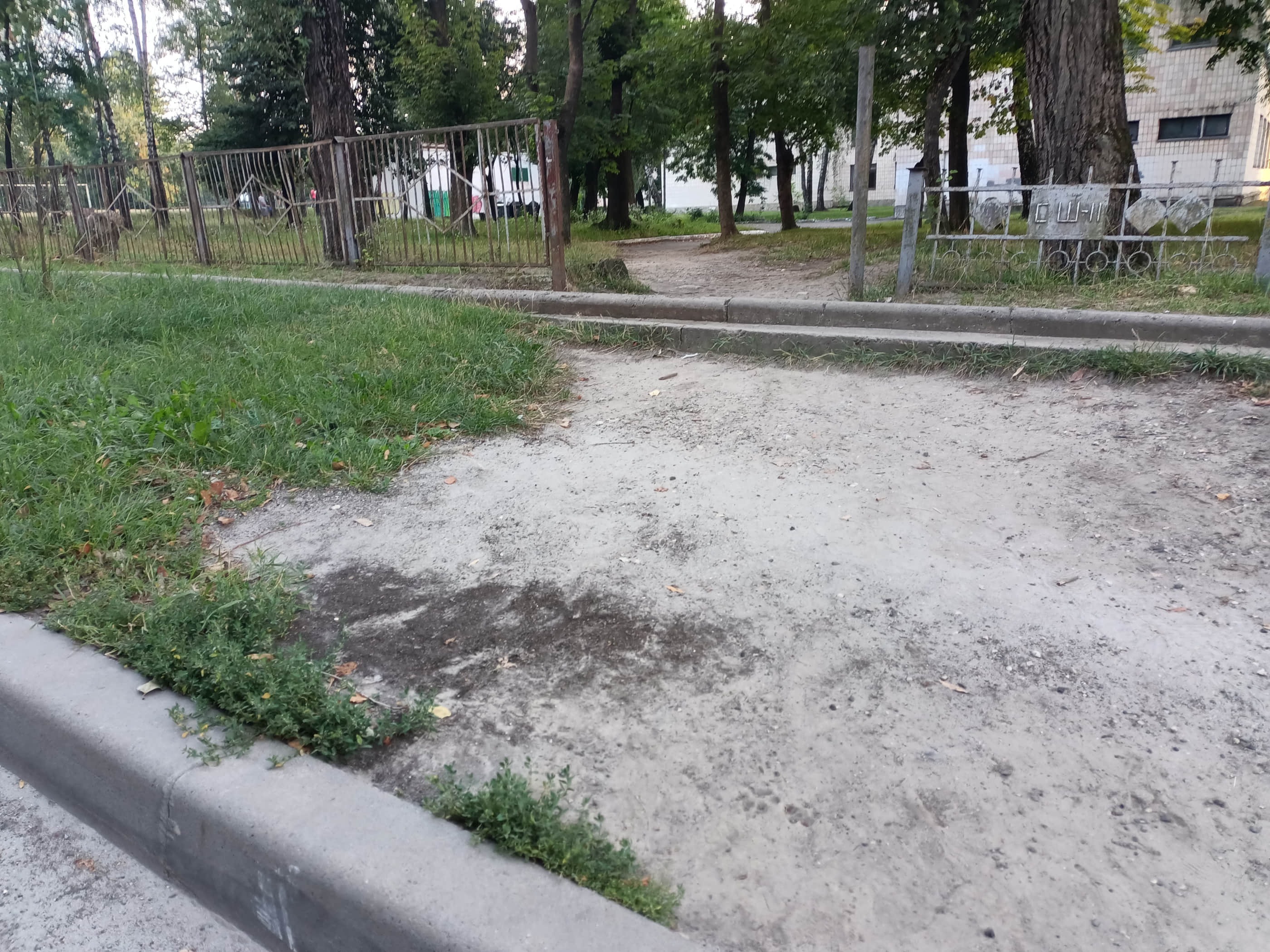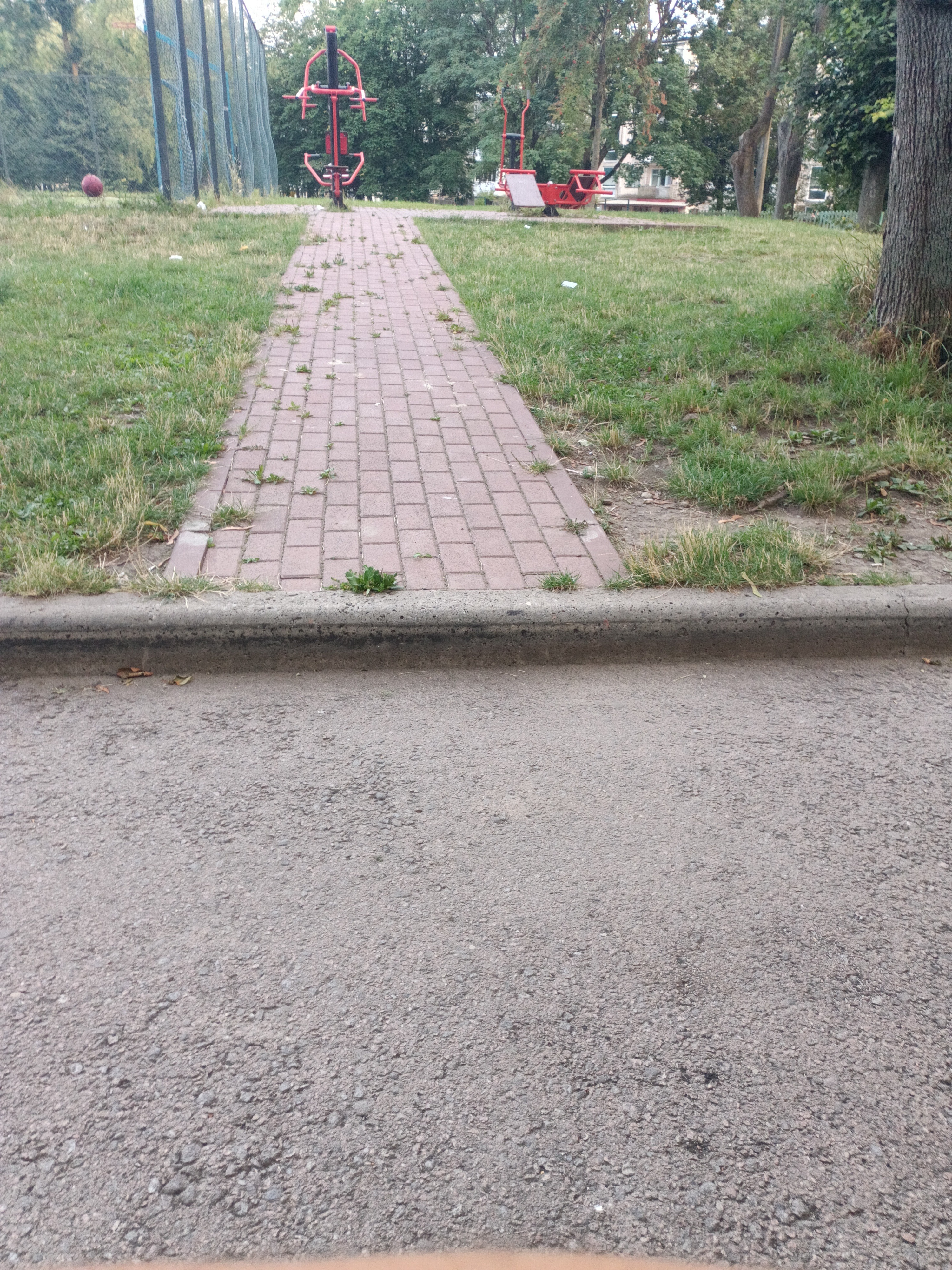 Пересуваючись дорогою, я бачив футбольне та волейбольне поле, спортивний майданчик, вуличні тренажери, тощо. До кожної з цих локацій ведуть як ґрунтові так і вимощені плиткою стежки, але перед кожною є бордюр 😥