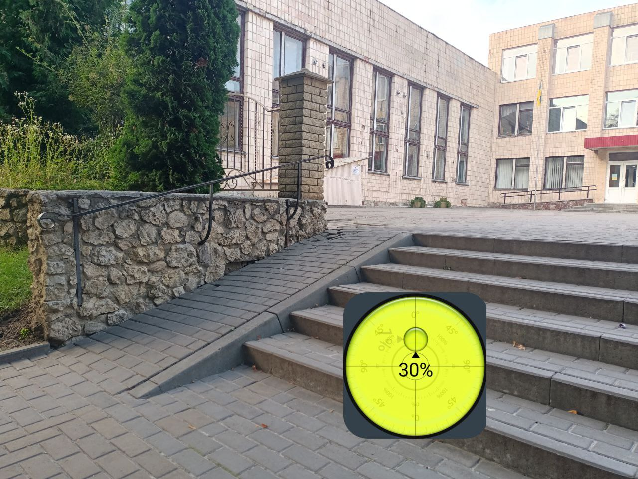 Далі заміряв “Пандус” з ухилом 30%, який забезпечує інклюзію в школі 🤯 (має бути 5%, тобто перевищено в 6 разів”)