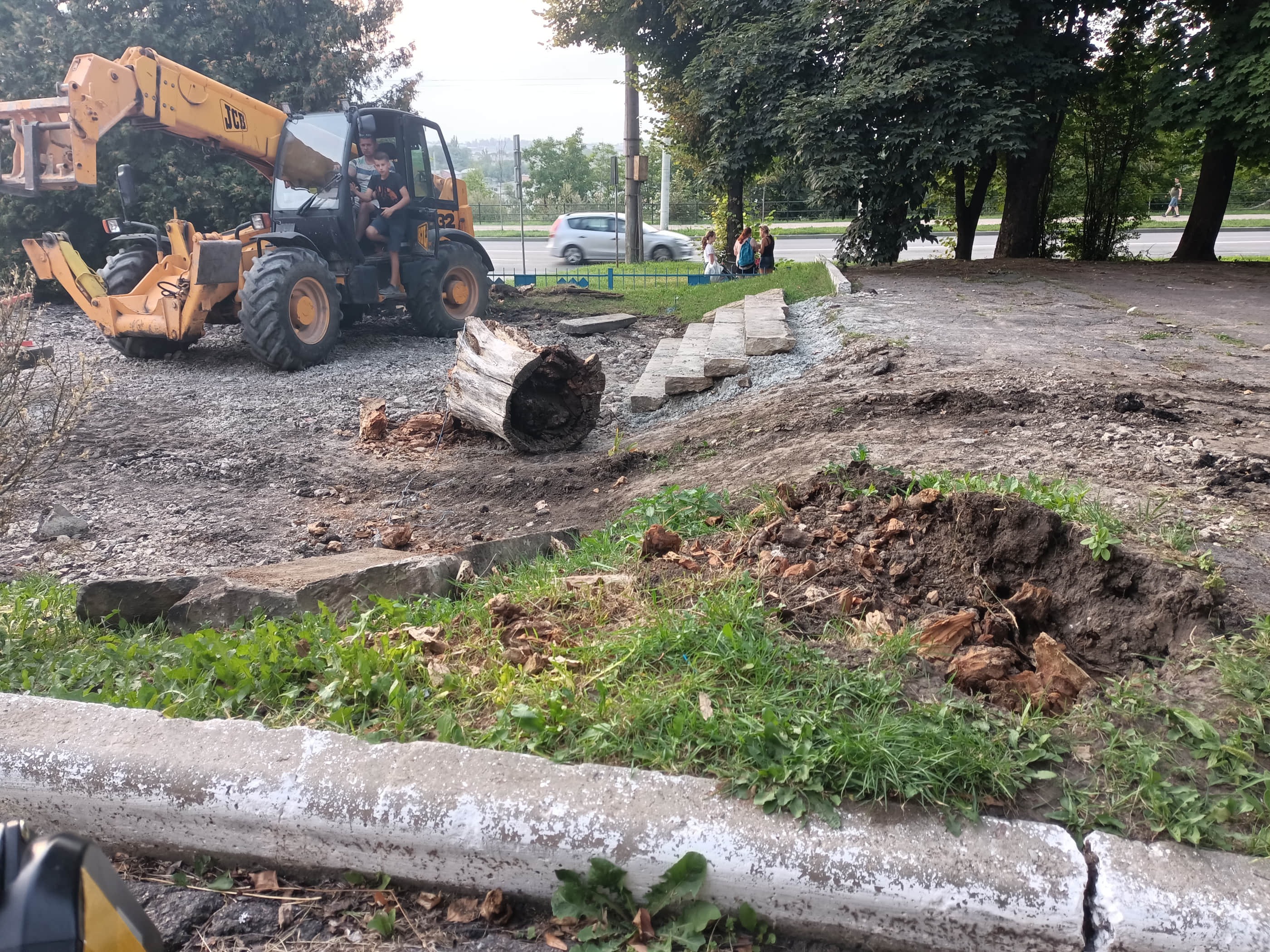 Поки що розбирають старі сходи, які замінять новими. Але, гляньте, ландшафт так і просить зробити пологу доріжку (пандус) біля сходів.