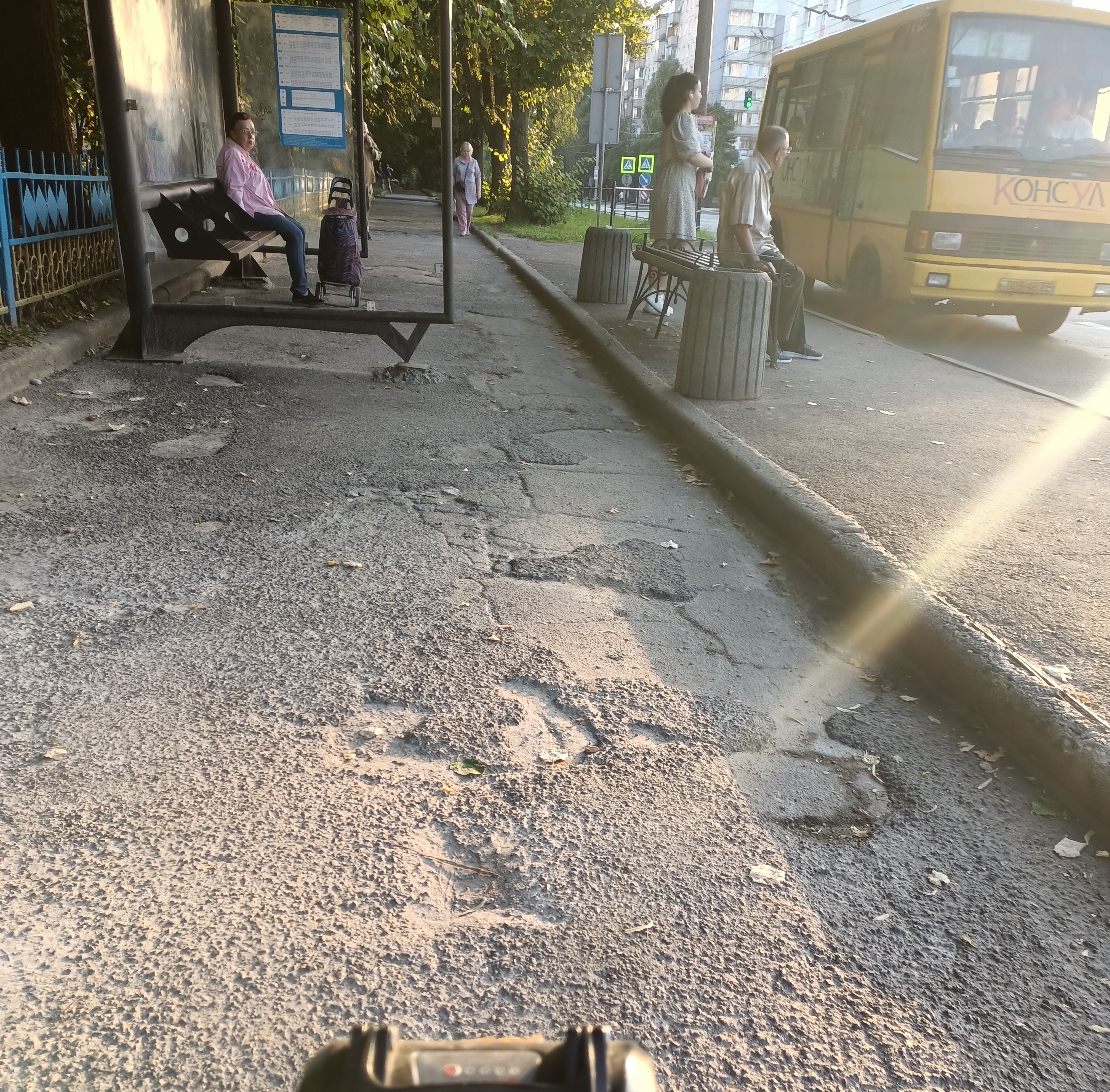 Під’їхавши до школи, перше, на що звернув увагу, це плачевний стан зупинки громадського транспорту. Урбаністичний кошмар 🤯. Можна спостерігати нашарування різних підходів до благоустрою протягом років 😅